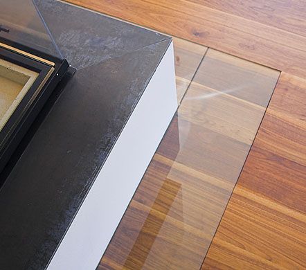 Bündig in die Fußbodendielen eingesetzter Funkenschutz am Kamin